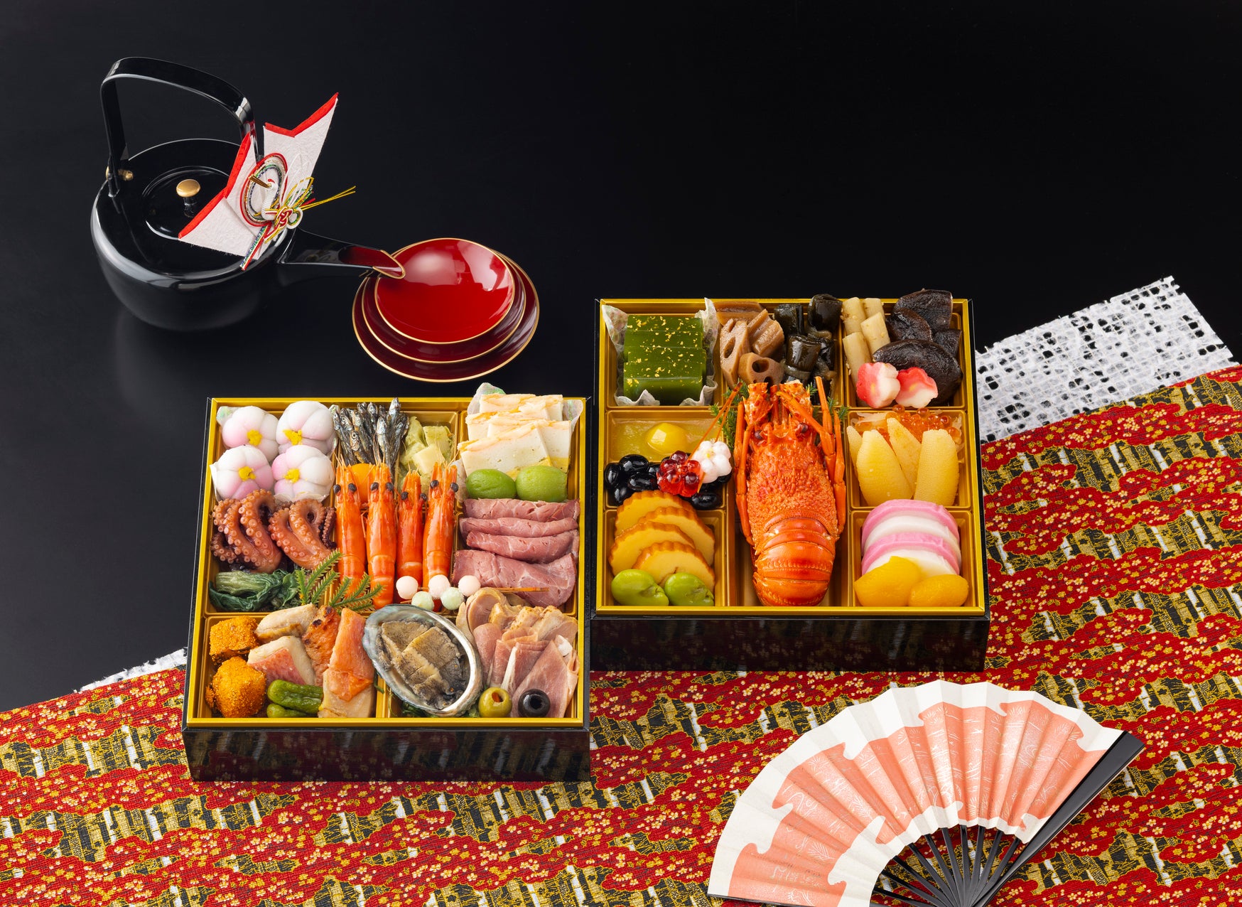 | 原材料・成分 | 一の重----------------------- <抹茶金箔ようかん>砂糖、粉あめ、白生餡、ゼラチン、宇治抹茶、寒天 <蓮根山椒煮>れんこん、砂糖、醤油、醸造調味料、還元水あめ、山椒粉、かつお節粉 <にしん昆布巻>昆布、醤油、砂糖、かんぴょう、にしん、寒天 <牛蒡煮>ごぼう、醸造酢、醤油、砂糖、ごま、食塩 <椎茸醤油煮>椎茸、砂糖、醤油、鰹節調味液 <梅麩甘煮>小麦たん白、もち粉、果糖、砂糖 <芋きんとん>さつま芋、砂糖、オリゴ糖、寒天加工品 <黒豆煮>黒大豆、砂糖、赤酒、みりん、ワイン、食塩 <栗甘露煮>栗、砂糖 <二色梅ゼリー串>砂糖、マルトース、水飴、寒天、みじん粉、粉末オブラート <伊達巻>鶏卵、砂糖、魚肉(鱈)、澱粉、発酵調味料、食塩、植物油 <空豆塩煮>空豆、オリゴ糖、食塩 <ロブスター>イセエビ <大根と人参のなます>大根、砂糖、醸造酢、人参、食塩 <いくら醤油漬け>鮭卵、醤油、水飴、発酵調味料、砂糖、デキストリン、オリゴ糖、昆布エキス、食塩、かつお節エキス、ほたてエキス <数の子醤油漬け>にしん卵、醤油、砂糖混合異性化液糖、還元水飴、米発酵調味料、魚介エキス、植物蛋白加水分解物、食塩 <紅蒲鉾>魚肉(スケソウタラ)、発酵調味料、食塩、砂糖、小麦たん白、醸造酢 <白蒲鉾>魚肉(スケソウタラ)、発酵調味料、食塩、砂糖、小麦たん白、醸造酢 <杏子白ワイン煮>干しあんず、砂糖混合ぶどう糖果糖液糖、白ワイン、砂糖 二の重----------------------- <梅餅>上新粉、砂糖、小豆粒あん(小豆、砂糖、水飴、還元麦芽糖水飴、食塩)、でん粉、白練り餡(白生餡(ライマメ)、砂糖、水飴)、寒梅粉 <片口鰯の田作り>片口いわし、砂糖、水飴、醤油、食塩、寒天 <金柑煮>きんかん、砂糖 <筍木の芽和え>筍、白味噌、醤油、発酵調味料、ほうれん草、加糖卵黄、砂糖、酒、みりん、かつお節エキス、山椒 <紅ズワイガニの紅白テリーヌ>魚肉すり身(イトヨリダイ、砂糖)、紅ズワイガニ、鶏卵、乳等を主要原料とする食品、人参、牛乳、砂糖、植物油脂、澱粉、昆布、食塩、魚介エキス、ワイン、発酵調味料、わかめ、乳たん白 <若桃のシロップ漬け>桃、砂糖、リキュール <たこ照り焼き>ボイルたこ(たこ、食塩)、果糖ぶどう糖液糖、醤油、砂糖、米発酵調味料、食塩、かきエキスパウダー、酵母エキス、たん白加水分解物、香辛料 <菜の花醤油漬け>なの花、漬け原材料(アミノ酸液、発酵調味料、食塩) <海老艶煮>ボイル海老、醤油、砂糖、清酒、みりん、かつお節エキス、昆布エキス <二色串餅>上用粉、砂糖、麦芽糖、もち粉 <キノコと玉葱のグレービー>玉ねぎ、人参、レッドキドニー、ガルバンゾー 、マッシュルームスライス、ビーフグレービー、砂糖、白醤油風調味液(アミノ酸調味液)、トマトケチャップ、ブイヨン <ローストビーフ>牛もも肉、食塩、ぶどう糖、香辛料 <真鱈子と昆布甘露煮>真鱈卵、昆布、水飴、醤油、ブドウ糖果糖液糖、砂糖、食塩、発酵調味料、酵母エキス、魚介類エキス、醸造酢 <金目鯛西京焼き>金目鯛、米味噌、発酵調味料、砂糖、食塩 <きゅうり醤油漬け>きゅうり、漬け原材料(アミノ酸液、醤油、食塩、ぶどう糖果糖液糖、砂糖、青じそ、唐辛子) <中華わかめ>茎わかめ、寒天、食用植物油脂、砂糖混合異性化液糖、醤油、木くらげ、白ごま、唐辛子、食塩、たん白加水分解物、醸造酢 <鮑醤油煮>アワビ、醤油、みりん、砂糖、発酵調味料、昆布エキス、かつお節エキス、食塩 <スモークロースハム>豚肩肉、糖類(水あめ、砂糖)、食塩、乳たん白、たん白加水分解物、ポークブイヨン、植物性たん白、卵たん白、野菜ブイヨン <合鴨オレンジソース煮>あい鴨肉、水飴、醤油、濃縮オレンジ果汁、砂糖、ワイン、米発酵調味料、食塩、醸造酢、紅茶、麦芽エキス、かつおエキス、酵母エキス <ブラックオリーブ塩漬け>オリーブ、漬け原材料(食塩) <スタッフドオリーブ塩漬け>オリーブ、赤ピーマン、漬け原材料(食塩) |